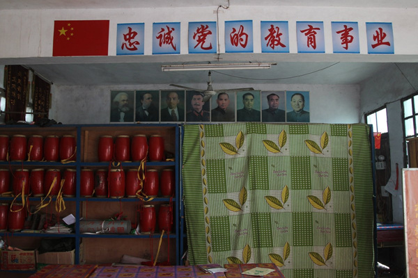 教室门上贴着“九一八 钓鱼岛;勿忘国耻,抵制日货”。