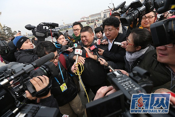 3月5日,北京,十二届全国人大一次会后,在大会堂北大厅通道证监会主席遭大量记者围堵时艰难突围。