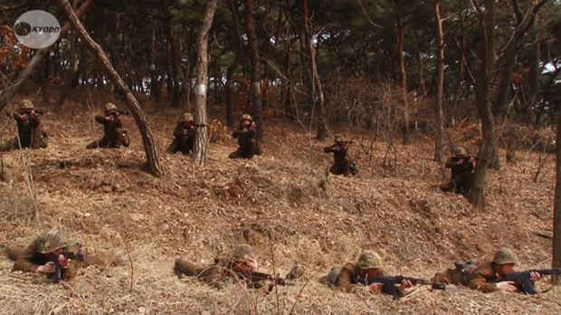当地时间2013年3月6日,朝鲜平壤,金正日军事大学的士兵举行军演。当天,朝鲜人民军还向媒体公开了射击训练场面。