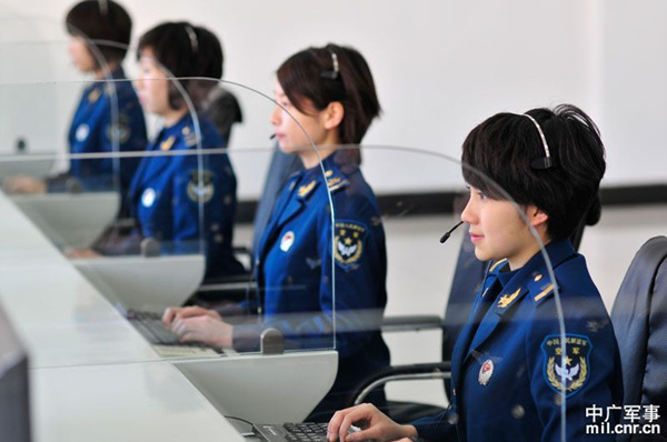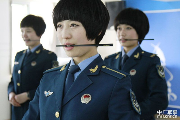 北空某通信总站话务女兵咬筷子练微笑(1)