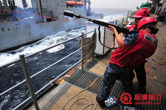当地时间2011年7月11日,海军枪手Megan Halliburton从两栖攻击舰上向军事海运司令部军火船射出一条抛绳。