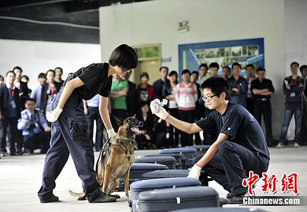民警在搜毒犬“丫丫”搜索到的可疑箱包里拿出毒品。警方供图